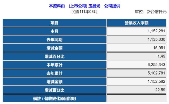 7 月 7 日,玉晶光披露了公司 2022 年 6 月的營(yíng)收情況。公告顯示,玉晶光當月實(shí)現營(yíng)收 11.52 億元新臺幣,月增 42.53%,年增 1.49%;該公司上半年實(shí)現營(yíng)收合計 62.55 億元新臺幣,與去年同期相比增長(cháng) 22.59%。