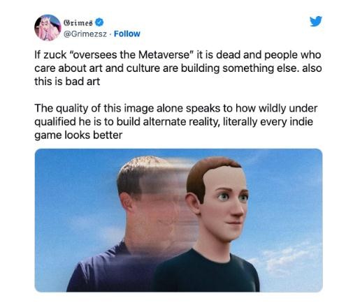 格萊姆斯在推特上寫(xiě)道:“如果讓扎克伯格來(lái)‘管理元宇宙’,那么它就會(huì )死掉,關(guān)心藝術(shù)和文化的人正在構建其他東西。”格萊姆斯真名為克萊爾?鮑徹 (Claire Boucher),她的這一表態(tài)是在回應扎克伯克近期接受播客節目采訪(fǎng)時(shí)的一篇文章。