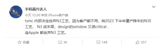 來(lái)自中國臺灣芯片產(chǎn)業(yè)鏈的數碼博主 @手機晶片達人 表示,臺積電內部已經(jīng)決定放棄 N3 工藝,因為客戶(hù)幾乎都不愿意用,包括蘋(píng)果,發(fā)展方向將轉向 2023 下半年量產(chǎn)的 N3E 工藝。據稱(chēng),N3 成本高,N3E 更具性?xún)r(jià)比。