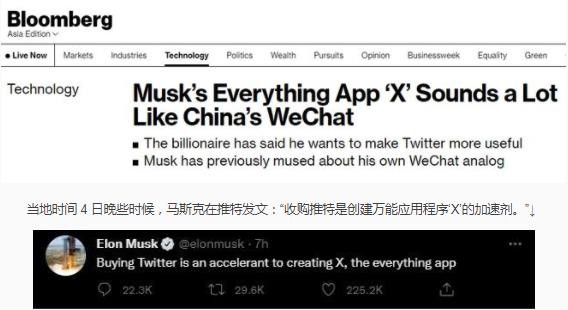 “馬斯克的萬(wàn)能應用程序‘X’聽(tīng)起來(lái)很像中國的微信。”美國彭博社當地時(shí)間 4 日以此為題對馬斯克收購推特事件進(jìn)行了報道,并提到了中國手機應用程序——微信。