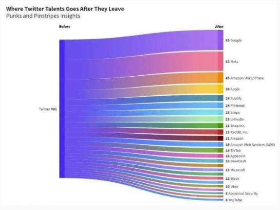 Punks&Pinstripe 分析發(fā)現,在過(guò)去三個(gè)月離開(kāi)推特的員工中,近 30% 的人去了谷歌或 Meta。與此同時(shí),還有數十個(gè)人轉到了其他頂級社交平臺上,包括 Pinterest、LinkedIn、Snap 和 TikTok 等。Punks&Pinstripe 首席執行官格雷格·拉金(Greg Larkin)也指出,許多推特員工轉到了初創(chuàng )企業(yè)。