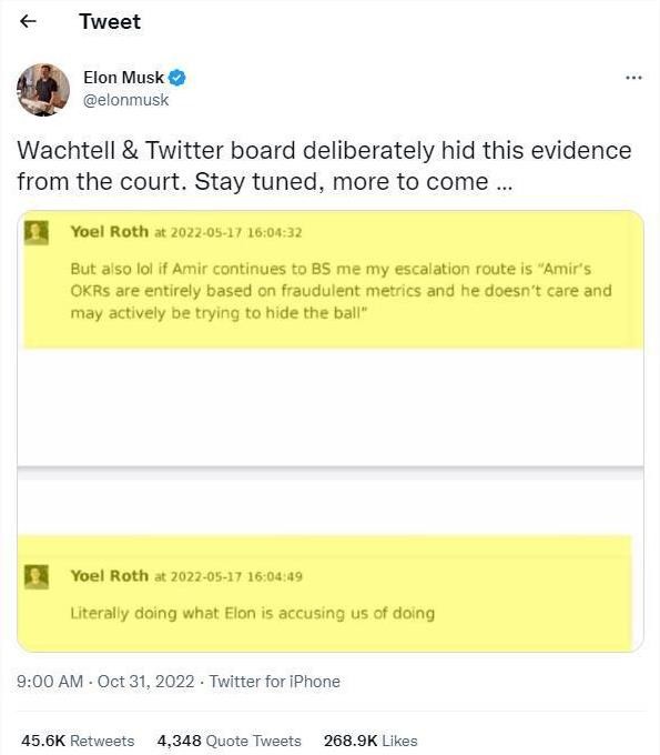 馬斯克在推特上稱(chēng),“Wachtell 律師事務(wù)所和推特董事會(huì )故意向法院隱瞞了這一證據。”馬斯克似乎還威脅要采取進(jìn)一步的法律行動(dòng),他寫(xiě)道:“請繼續關(guān)注,還會(huì )有更多信息……”