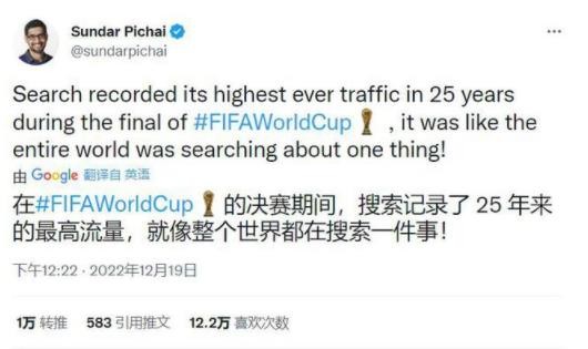 谷歌CEO表示 卡塔爾世界杯決賽期間刷新了公司成立以來(lái)最高流量紀錄 16:40:59