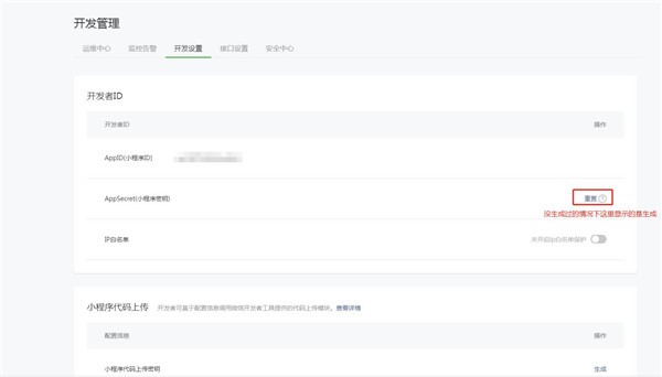 3.到設置頁(yè)面后我們可以看到第一個(gè)是AppID(小程序ID),這個(gè)參數是自帶的,無(wú)需生成,然后下面的AppSecret(小程序密鑰)是需要自己生成的,這兩個(gè)參數很重要?;緦尤魏螙|西都需要。AppSecret沒(méi)有生成過(guò)的情況下會(huì )顯示生成,如果已經(jīng)生成過(guò)了會(huì )顯示重置。