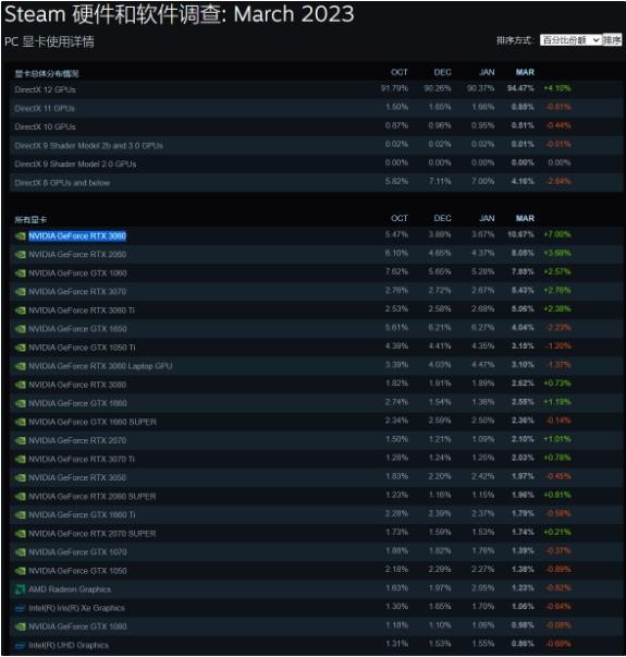 今年三月,RTX 3060 以 10.67% 的占有率登上顯卡數據的榜首,RTX 2060 和 GTX 1060 分居二、三名,而上個(gè)月的冠軍 GTX 1650 直接跌出榜單前五,占有率僅為 4.04%。本月,RTX 4090 份額達到了 0.25%,,而 RTX 4070 Ti 也有 0.23%。