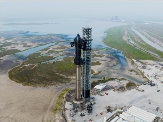 在得克薩斯州南部博卡奇卡村附近的基地中,SpaceX 公司的第一艘軌道星際飛船放置在其巨大的超級重型助推器之上。