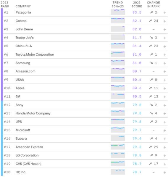 排名第 1 的是高端環(huán)保服裝品牌巴塔哥尼亞(Patagonia),相比去年前進(jìn)了 2 位。而倉儲會(huì )員制折扣店 Costco 的排名則飆升 24 位,來(lái)到第 2。排名第 3 的是機械設備品牌約翰迪爾(John Deere)。