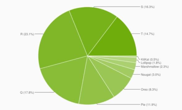 根據最新的數據,去年發(fā)布的 Android 13(T) 目前在全球所有 Android 設備中大約占有 15% 的份額,仍落后于 Android 10、11 和 12。目前使用人數最多的 Android 系統版本是 2020 年發(fā)布的 Android 11,其用戶(hù)占比約為 23.1%。