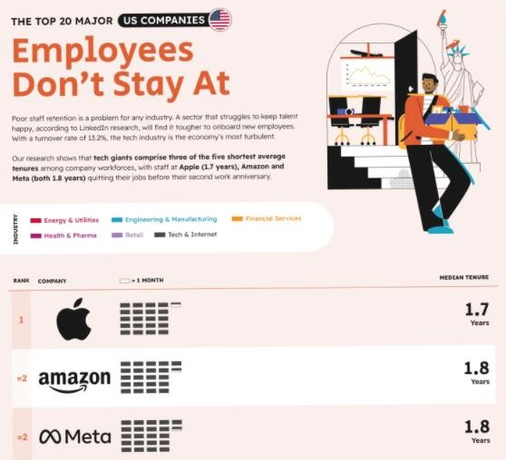 研究報告稱(chēng)蘋(píng)果公司的員工平均 1.7 年就會(huì )跳槽;亞馬遜和 Meta 的員工平均 1.8 年就跳槽;特斯拉則是 2 年時(shí)間。