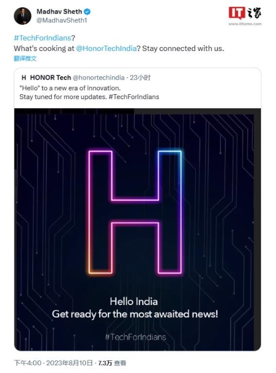 榮耀將久違地在印度發(fā)布新品手機,HONOR Tech 官方 X 賬號日前發(fā)布帖子,宣布將為印度市場(chǎng)帶來(lái)新消息。隨后 realme 印度前首席執行官 Madhav Sheth 轉發(fā)了這條帖子,確認將加盟榮耀。