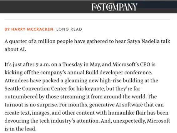 外媒 Fast Company 的一篇新文章概述了微軟在最近大量 AI 頭條新聞中的領(lǐng)先地位,該雜志表示,這在很大程度上要歸功于其首席執行官納德拉的“真知灼見(jiàn)”。