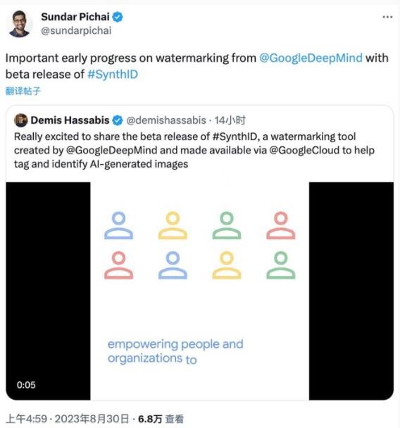 現在,Google DeepMind 宣布針對圖像生成推出一種添加水印的工具 SynthID,以識別 AI 生成的圖像,目前 SynthID Beta 版已經(jīng)上線(xiàn)。谷歌 CEO Sundar Pichai 和 Google DeepMind CEO 都轉推介紹了 SynthID 工具。