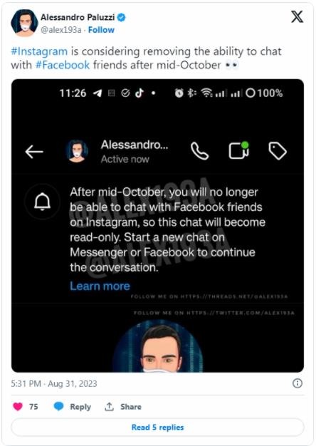 開(kāi)發(fā)者 Alessandro Paluzzi 通過(guò)逆向編譯應用程序,暗示在今年 10 月開(kāi)始,Meta 公司將會(huì )關(guān)閉 Facebook 和 Instagram 跨應用消息。