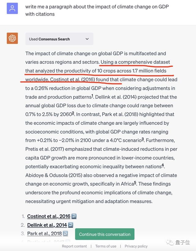 比如:“給我寫(xiě)一段關(guān)于氣候變化對 GDP 影響的論述,并附上引文。”