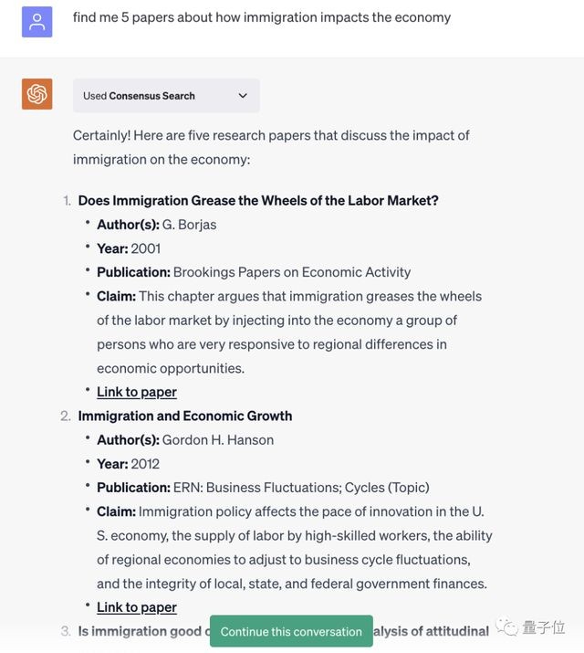 比如:“給我找 5 篇關(guān)于移民如何影響經(jīng)濟的論文”,插件給出的答案就是這樣的: