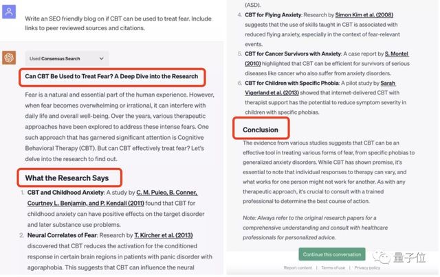 提示詞如“寫(xiě)一篇 SEO 友好的博客,討論 CBT(認知行為療法)是否可以治療恐懼,包含經(jīng)同行評審的論文鏈接”。
