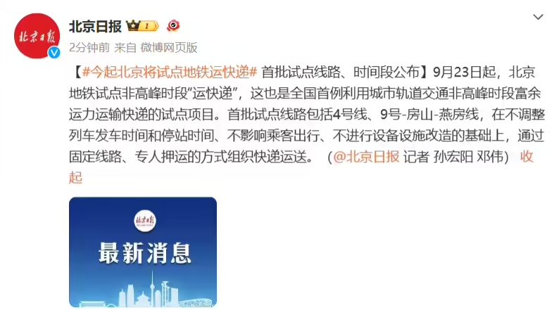 全國首例,北京地鐵今日起試點(diǎn)非高峰時(shí)段“運快遞”