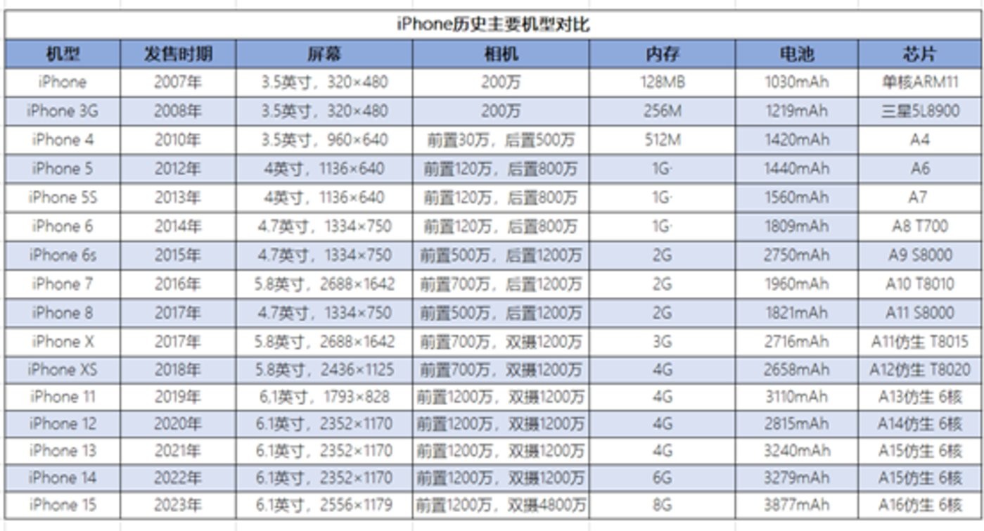 同樣地,2007 年 1 月 9 日,初代 Iphone 手機發(fā)布,從此手機行業(yè)正式開(kāi)啟智能化階段,蘋(píng)果公司始終攥著(zhù)行業(yè)中最核心的技術(shù),并扮演行業(yè)引領(lǐng)者的角色,其新品技術(shù)規格幾乎可以代表整個(gè)手機行業(yè)當下的“頂配”。