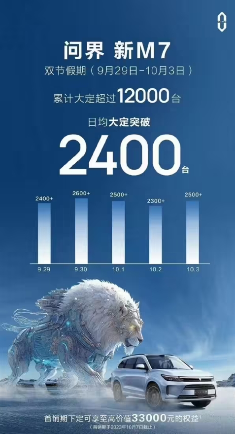 如此看來(lái),意味著(zhù) 10 月 1 日-5 日期間,該車(chē)每日新增的訂單量最起碼已經(jīng)超過(guò) 2000 輛。而在問(wèn)界汽車(chē)的另一張較早發(fā)布的海報中顯示,問(wèn)界新 M7 在 9 月 29 日-10 月 3 日期間,已經(jīng)取得超過(guò) 12000 輛的大定,日均大定突破 2400 輛。