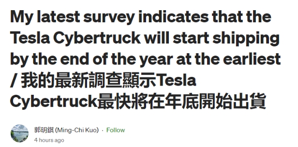 郭明錤稱(chēng)特斯拉的 Cybertruck 電動(dòng)皮卡最快年底前開(kāi)始交付