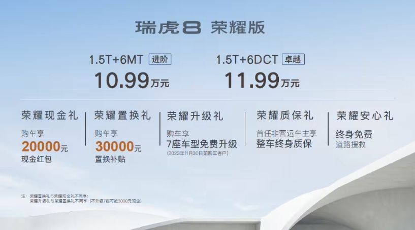 瑞虎 8 榮耀版還推出 5 重購車(chē)禮遇,其中購車(chē)限時(shí)可享 7 座車(chē)型免費升級,附相關(guān)內容如下:
