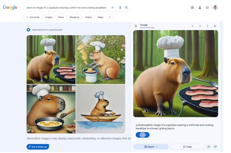 有時(shí)用戶(hù)將正在尋找特定的圖像,但無(wú)法準確找到自己想要的圖像。為此,從今天(當地時(shí)間本周四)開(kāi)始,谷歌將推出利用人工智能驅動(dòng)的生成搜索體驗 (SGE) 創(chuàng )建圖像。例如,用戶(hù)想為一位喜歡烹飪且最喜歡的動(dòng)物是水豚的朋友制作一張卡片,可以利用該功能搜索類(lèi)似“畫(huà)一張戴著(zhù)廚師帽和烹飪早餐的水豚的圖片”,SGE 將在結果中提供最多四個(gè)生成的圖像。用戶(hù)可以根據搜索結果進(jìn)一步編輯描述并添加更多細節,將自己的愿景變?yōu)楝F實(shí)。