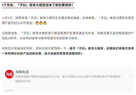 據網(wǎng)易有道官方公眾號,網(wǎng)易有道“子曰”教育大模型今日通過(guò)相關(guān)備案,該大模型及其應用產(chǎn)品將對公眾開(kāi)放。