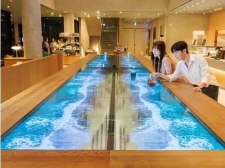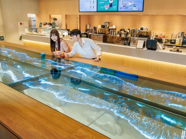 LG Display 在星巴克打造 8 米 12 連屏透明 OLED 桌面,放置杯子會(huì )產(chǎn)生波浪效果