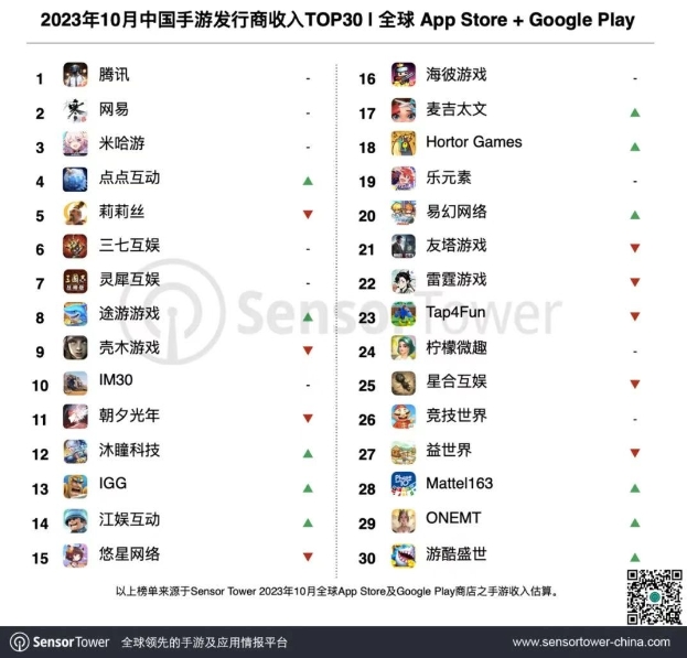 10月中國手游發(fā)行商全球收入排行榜:網(wǎng)易《蛋仔派對》重回中國iOS手游暢銷(xiāo)榜前十
