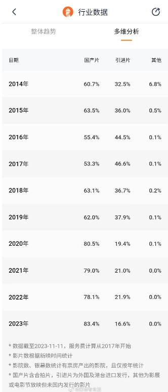 中國 2023 年度電影總票房突破 500 億,國產(chǎn)片占 83.4%