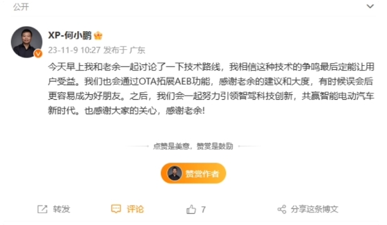 最后,何小鵬在官方微博賬戶(hù)公開(kāi)發(fā)文,稱(chēng)其早上與余承東就技術(shù)路線(xiàn)進(jìn)行了探討,但沒(méi)有給出結論,只是對余承東的建議和大度表達了感謝,并感慨“有時(shí)候誤會(huì )后更容易成為好朋友”。