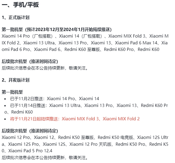 11月21日起陸續推送:小米MIX Fold 3、小米MIX Fold 2。