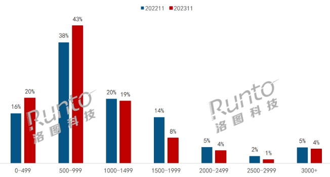 當月低于 1000 元售價(jià)的產(chǎn)品仍是線(xiàn)上市場(chǎng)主力,銷(xiāo)量占比與去年同期相比增長(cháng)了 9%。該價(jià)位段頭部國產(chǎn)品牌成功實(shí)現銷(xiāo)量逆勢增長(cháng)。