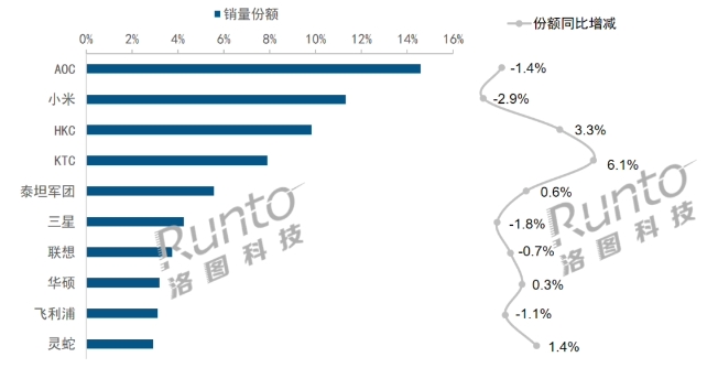 當月顯示器銷(xiāo)量排名前四品牌為 AOC、小米、HKC 和 KTC。其中,AOC 和小米共同成為唯二銷(xiāo)量突破 10 萬(wàn)臺的品牌,但市場(chǎng)份額分別下降了 1% 和 3%。
