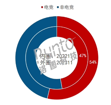 當月電競產(chǎn)品銷(xiāo)量占比 54%,較去年同期增 7%,絕對銷(xiāo)量同比下降 18.8%。