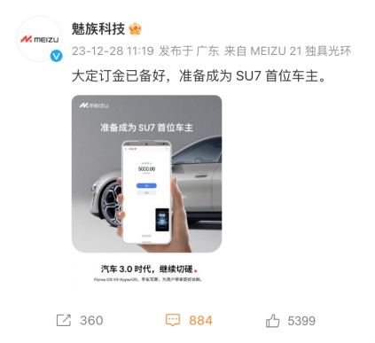 昨日,魅族科技官方微博發(fā)文稱(chēng),大定訂金已備好,準備成為 SU7 首位車(chē)主。
