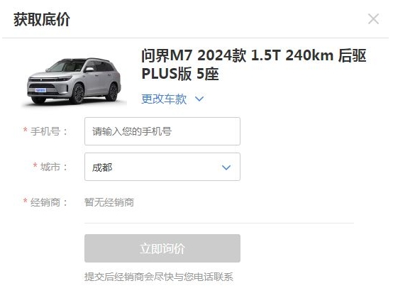 紅星資本局在懂車(chē)帝上搜索問(wèn)界和智界車(chē)型,發(fā)現點(diǎn)擊“獲取底價(jià)”后,提示“該車(chē)型經(jīng)銷(xiāo)商暫未入駐平臺,實(shí)際報價(jià)請詳詢(xún)當地經(jīng)銷(xiāo)商。”汽車(chē)之家上,問(wèn)界和智界車(chē)型的“詢(xún)底價(jià)”按鈕變灰,經(jīng)銷(xiāo)商參考價(jià)顯示為“暫無(wú)”。易車(chē)網(wǎng)上,選擇問(wèn)界和智界車(chē)型獲取底價(jià),“立即詢(xún)價(jià)”按鈕變灰,顯示暫無(wú)經(jīng)銷(xiāo)商。