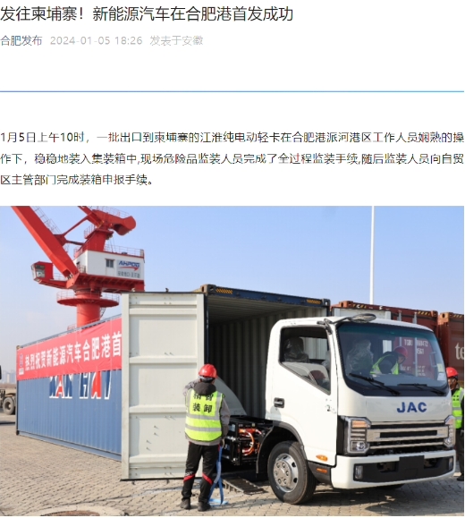 據合肥發(fā)布公眾號,一批出口到柬埔寨的江淮純電動(dòng)輕卡在合肥港派河港區裝入集裝箱中,現場(chǎng)危險品監裝人員完成了全過(guò)程監裝手續,隨后監裝人員向自貿區主管部門(mén)完成裝箱申報手續。