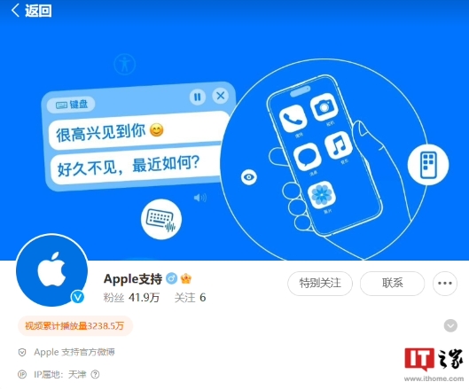 蘋(píng)果此前已開(kāi)通 Apple 支持官方微博,兩個(gè)賬號均顯示 IP 屬地為“天津”,預計是同一個(gè)運營(yíng)方。