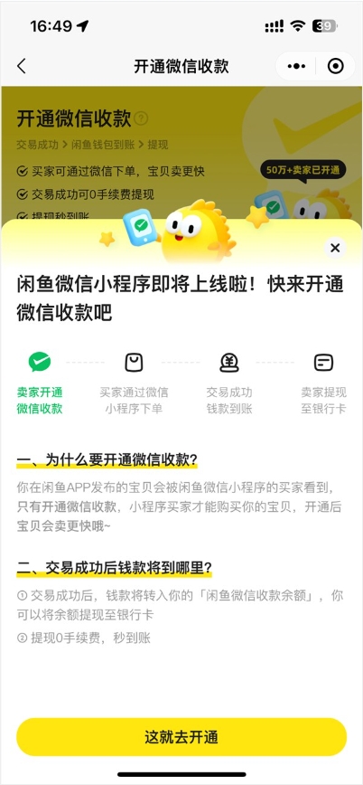 閑魚(yú)微信小程序上線(xiàn) 購買(mǎi)需商家開(kāi)通微信收款