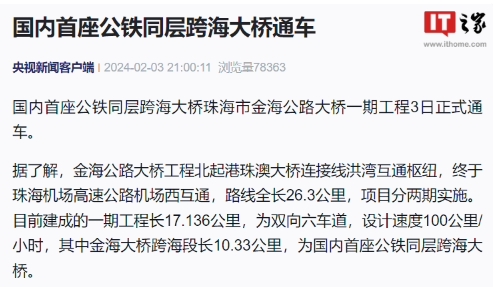 報道稱(chēng),金海公路大橋工程北起港珠澳大橋連接線(xiàn)洪灣互通樞紐,終于珠海機場(chǎng)高速公路機場(chǎng)西互通,路線(xiàn)全長(cháng) 26.3 公里,項目分兩期實(shí)施。目前建成的一期工程長(cháng) 17.136 公里,為雙向六車(chē)道,設計速度 100 公里 / 小時(shí),其中金海大橋跨海段長(cháng) 10.33 公里,為國內首座公鐵同層跨海大橋。