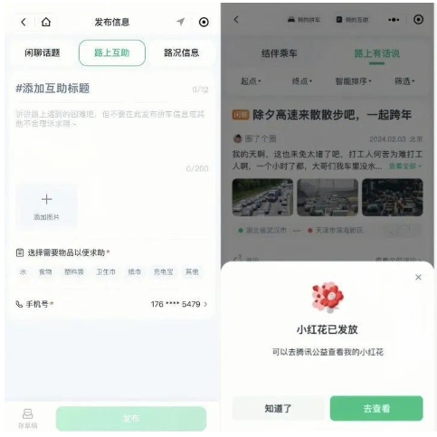 作為求助人,可發(fā)布“路上互助”話(huà)題,向他人求助,也可以發(fā)布實(shí)時(shí)路況,幫助更多返鄉人;