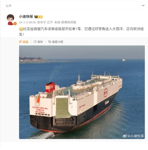 比亞迪首艘汽車(chē)滾裝運輸船 —— 開(kāi)拓者 1 號(EXPLORER NO.1),現已通過(guò)好望角進(jìn)入大西洋,正向歐洲進(jìn)發(fā)。