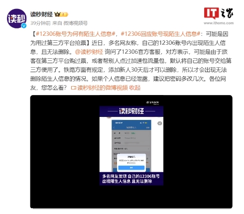 對此,12306 官方客服表示,可能是由于旅客在第三方平臺購過(guò)票,或者幫別人點(diǎn)過(guò)加速包流量包,默認將自己的賬號交給第三方使用了。鐵路方面有規定,添加新人 30 天后才可以刪除,所以才會(huì )出現無(wú)法刪除陌生人信息的情況。如果個(gè)人信息已經(jīng)泄露,建議把密碼多改幾次。