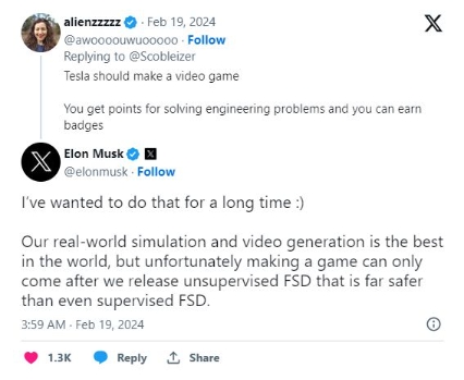 另有一位用戶(hù)發(fā)帖稱(chēng),“特斯拉應該做一款電子游戲”,這位首席執行官回應道,他想做這件事已經(jīng)很久了,他認為特斯拉的“真實(shí)世界模擬和視頻生成是世界上最好的”。