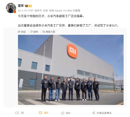雷軍表示,這次董事會(huì )選擇在小米汽車(chē)工廠(chǎng)召開(kāi),董事們參觀(guān)了工廠(chǎng)并試駕了小米 SU7。