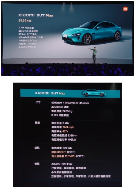 小米 SU7 Max 版搭載雙電機,擁有 2.78s 零百加速、265km/h最高時(shí)速、800km CLTC 續航、101kWh 麒麟電池三元鋰、15 分鐘補能 510km、小米智駕 Max、小米澎湃智能座艙,售價(jià) 29.99 萬(wàn)元。
