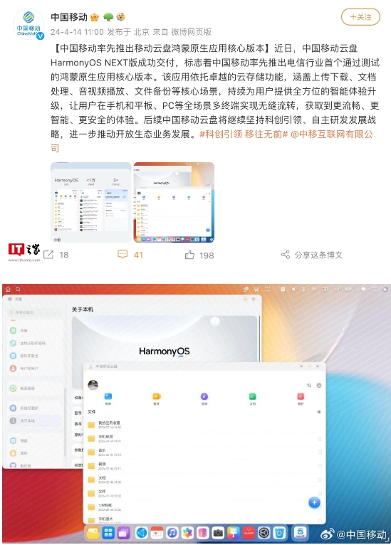 中國移動(dòng)宣布推出“移動(dòng)云盤(pán)”App 華為鴻蒙 HarmonyOS NEXT 版原生核心版本