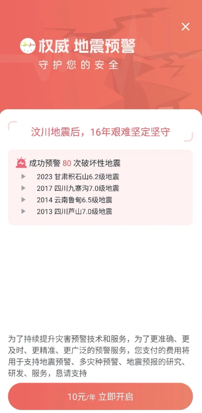 “地震預警”App 是“四川成都高新減災研究所”推出的一款災害資訊速報應用,這款應用安卓版本近日更新 9.0.0 版,主要加入了預警功能訂閱,訂閱價(jià)格為 10 元 / 年。