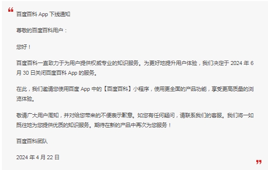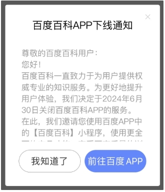 百度百科 App 近日彈出窗口通知,2024 年 6 月 30 日將關(guān)閉百度百科 App 服務(wù),將在百度 App 中的百度百科小程序繼續提供服務(wù)。